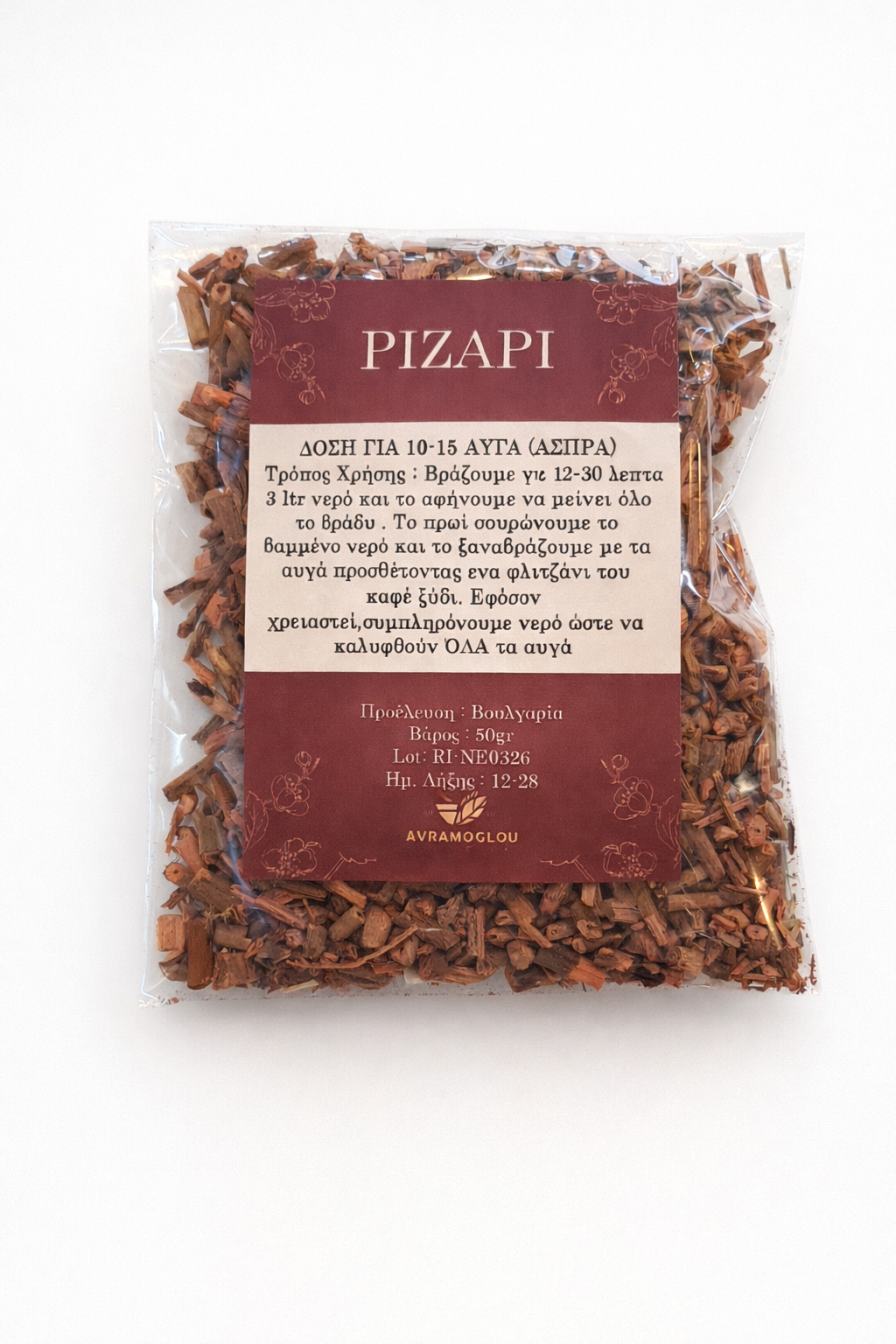 Σε μια κατσαρόλα προσθέστε νερό και ριζάρι (ρίζα από Rubia tinctorum) και αφήστε το να βράσει για 20–30 λεπτά ώστε να απελευθερωθεί η χρωστική. Σουρώστε το υγρό και προσθέστε 1–2 κουταλιές ξύδι για καλύτερο «δέσιμο» του χρώματος.